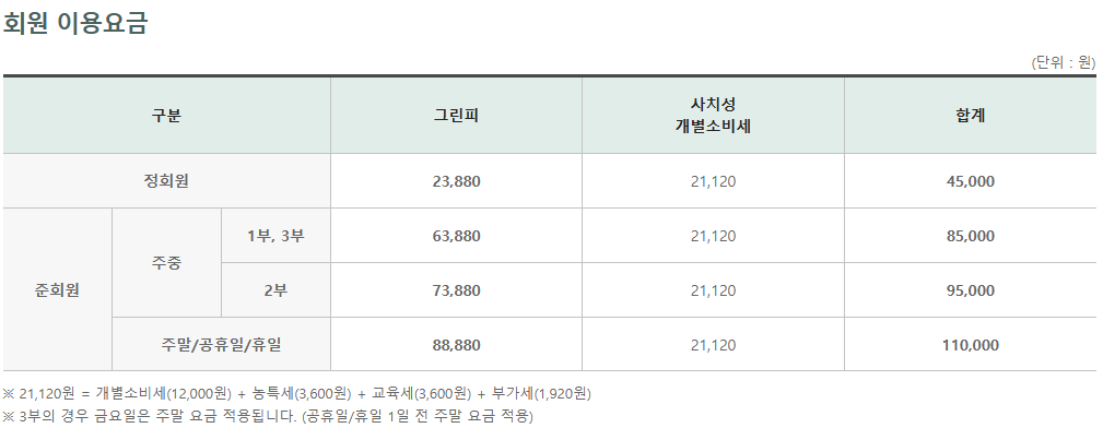 -준회원 : 주중8.5~9.5만원 / 주말11만원
